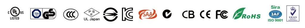 Conformité totale aux normes mondiales, notamment les certifications UL, CE, FCC, PSE, CB, KC, SAA, BSMI, C-Tick, UKCA, TÜV, GS, Sira, CCC et RoHS